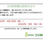 2022年4月20日 / 最終更新日時 : 2022年4月28日 fujiadm お知らせ GW休暇のお知らせ 誠に勝手ながら、2022年 4月 29日(金)〜 2022年 5月 5日(木)迄 休暇とさせていただきます。 宜しくお願いいたします。 2022年5月6日(金)より通常営業いたします。