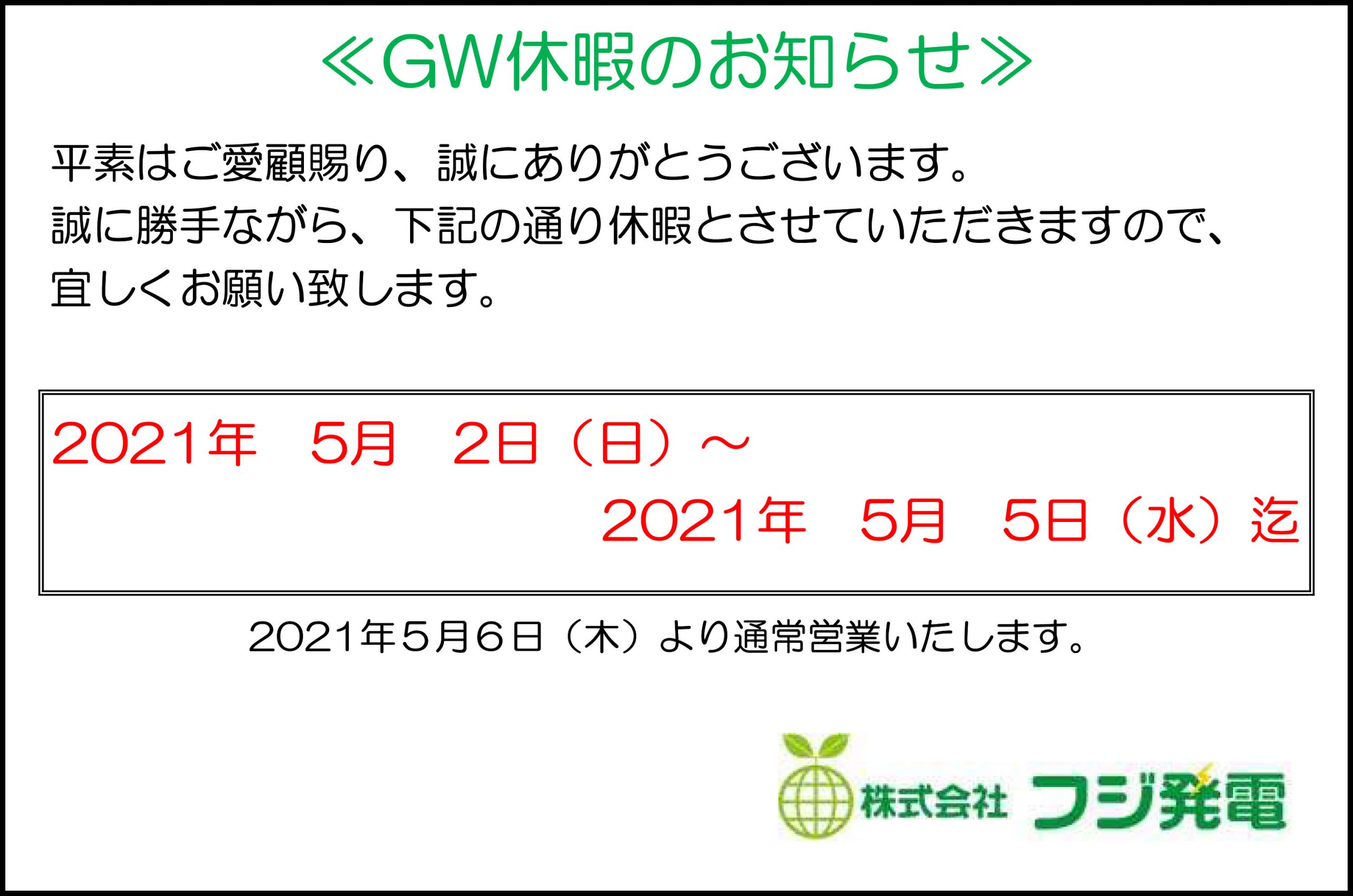 2021年4月26日 / 最終更新日時 : 2021年6月8日 fujiadm お知らせ GW休暇のお知らせ 誠に勝手ながら、2021年5月2日(日)~2021年5月5日(水)迄 休暇とさせていただきます。 宜しくお願いいたします。 2021年5月6日(木)より通常営業いたします。