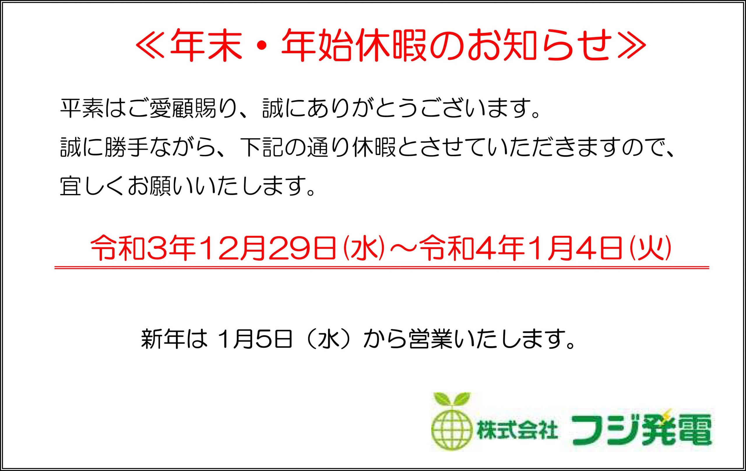 2021年12月11日 / 最終更新日時 : 2021年12月15日 fujiadm お知らせ 年末・年始休暇のお知らせ 誠に勝手ながら、令和3年12月29日(水)~令和4年1月4日(火)迄 年末年始休暇とさせていただきます。宜しくお願いいたします。